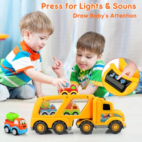 • 【Easy to Play for Kids】Just push the carrier construction truck forward, they will running forward by itself. Your boys can also open the tailgate to unload the small-vehicle. In addition, pull the small cars toys back, then release your hand, they will run forward by themselves. The truck cab and the trailer behind it can be separated at will. Cool boy toys trucks for toddlers 2-4 years.