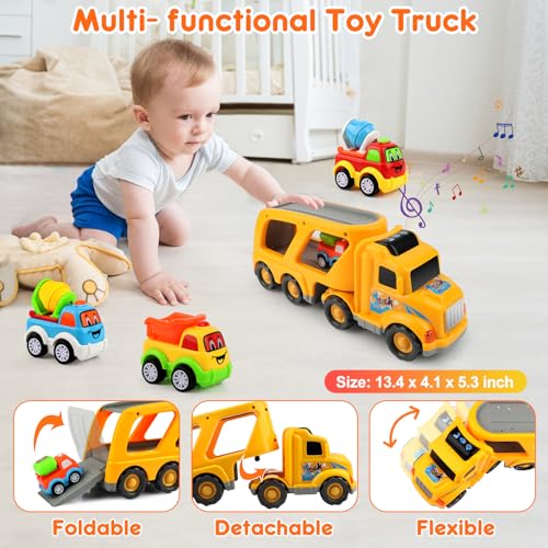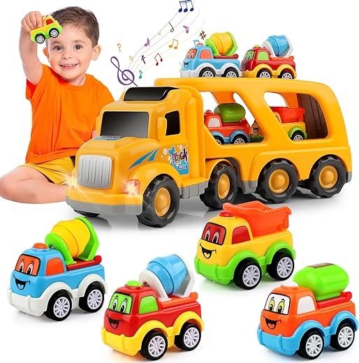 • 【Perfect Size for Toddlers’ Tiny Hand】This cartoon construction toys vehicle set is designed with scientific size, more suitable for 2-4 year old toddlers’ tiny hands. Ideal toys for 2 year old boy. 5 in 1 colorful construction toys, including a carrier transporter and four small trucks. Ideal toddler toys for kids age 1-3 2-3 2-4 boy.
